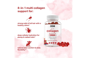 The product’s differentiated advantages enhance brand competitiveness. This collagen gummy adopts a sugar-free formula, integrating multi-type collagen (Types I, II, III, V, X) with golden ingredients such as biotin, vitamin C, and hyaluronic acid. It specifically targets skin anti-aging, hair care, and nail strengthening needs, aligning with modern consumers’ pursuit of natural and healthy beauty products. The product offers natural flavor options including pomegranate and berry, supports customized colors and shapes, and comes in a standard specification of 60 gummies per bottle or customized packaging to meet brands’ personalized positioning. Notably, the collagen undergoes hydrolysis treatment for significantly improved human absorption. Free from allergens such as malt, gluten, nuts, and dairy products, it caters to a broader adult consumer base, boasting strong market adaptability.